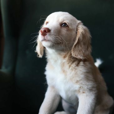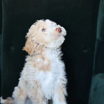 Jasper is an F1b Australian Mountain Doodle (Aussiedoodle with Bernese infusion). He has a gorgeous fleece coat and a people-focused, mellow temperament. We expect Jasper to be between 20-25lbs full grown; a perfect medium size.